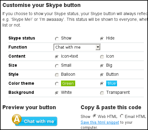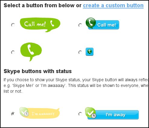 A second method is to use the Skype button wizard. The wizard gives additional options, like creating a "chat with me" button instead of a "call me" button:
