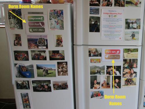 At Adventure Queenstown, several refrigerators are organized by room. Each fridge has 3 or 4 dorms names on the front. Having the guests store their food by room makes fridge clean out day slightly easier.