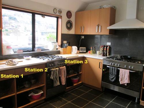 Rather than have all similar kitchen equipment stored together (i.e. all pots in one cabinet, all cutting boards in another) Adventure Queenstown has multiple 'stations' set up twice daily. These are equipped with a few pots and pans, one cutting board, one colander, etc. so guests can cook in one place without moving all over the kitchen. Having everything needed in one place really helps with traffic flow. The staff reorganize these stations each afternoon and night.