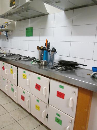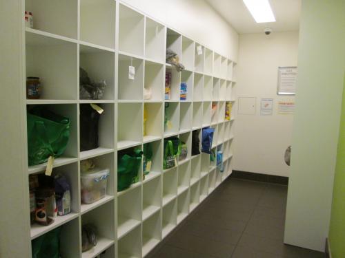 Several hostels have separate storage areas for dry food. Storing items separately rather than above the kitchen counters can help prevent food, sauces, etc from spilling onto the clean surfaces. Storing food below the counters can also help this, such as at Oaklands Lodge in Auckland: