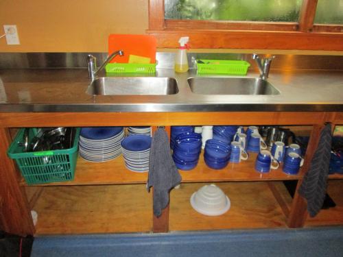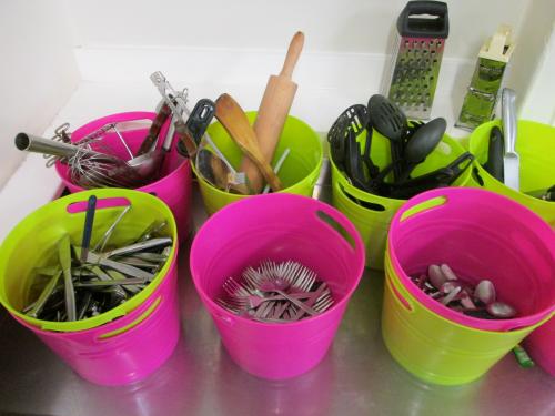 Another idea if you are a very large hostel is something like Downtown Backpackers has done, with colorful buckets for utensils: