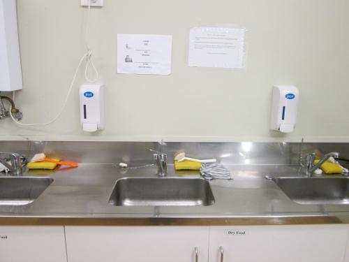 Lakefront Backpackers in Tekapo did a similar concept with their dish stations, to aid guests in properly washing up. They wanted to make sure each sink had a strong scrubbing brush to help ensure pots got thoroughly cleaned.